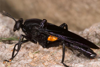 The larva is a small, white or cream-colored, worm-like stage that hatches from the egg. The larva burrows into the breeding material where it feeds and grows for several days. Usually, the larva leaves the breeding material and moves to a dry, protected place just before becoming a pupa.