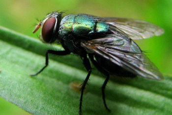 Besides contaminating food with eggs and maggots, flies can carry bacteria that cause intestinal diseases. Flies can travel from fecal material to our food very easily, carrying bacteria with them on body hairs or the sticky pads on their feet. When feeding, flies expel saliva and feces that may also contain bacteria. Sometimes flies will lay eggs or maggots on the flesh or wounds of man and animals.