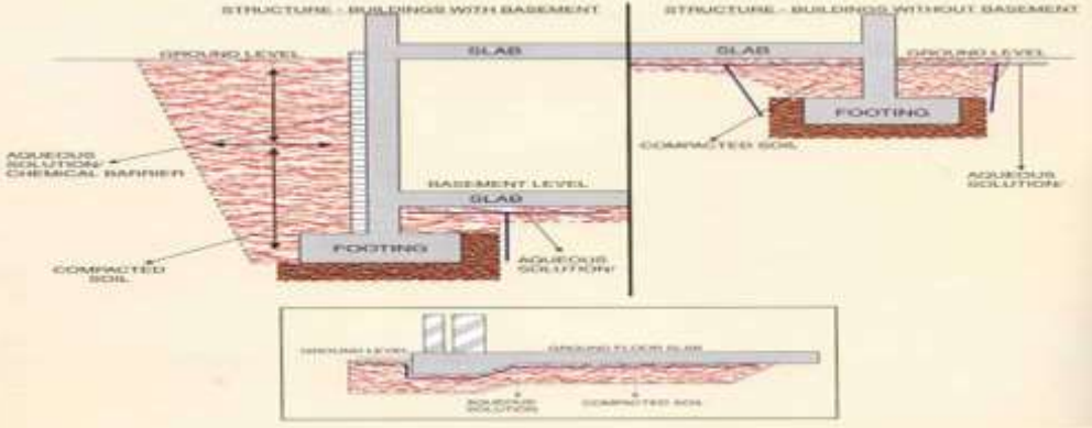 The Backfill soil surrounding the building and or the external walls from the basement to the ground level is treated as a vertical barrier. An aqueous solution of termiticide is prepared and applied at a specific rate by means of spraying, rodding, and injecting to the linear surface in a width of 30 cm from the boundary wall on each 100 cm depth of compacted backfilled soil.
