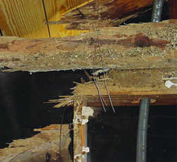 Wood damaged by termites has galleries that tend to run with the rain. Although some will cross the grain, these galleries can be distinguished from similar damage caused by other wood infestation insects because they usually contain soil particles instead of sawdust.